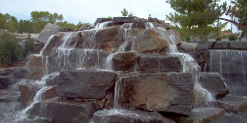 Boulder/Rock fountains are a style of waterfall. They are typically viewed from 360 degrees and consist of a stack of large boulders laid in a natural looking formation with a large volume of water cascading over them from a central location.
