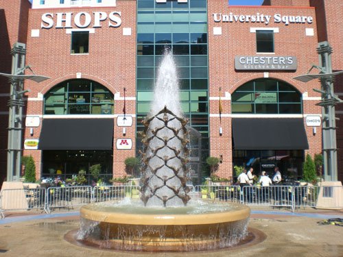 This is a single tier 15' diameter precast bowl fountain with a custom bronze sculpture set within an 18' deck-poured concrete pool. The fountain operates with both bronze submersible barnes fountain pumps, as well as a dry pumping system for water filtration. This system has forty-eight 35 watt low voltage brass lights in the surrounding pool trough. It also includes LED type lights all operated through a Flair built automated control panel.