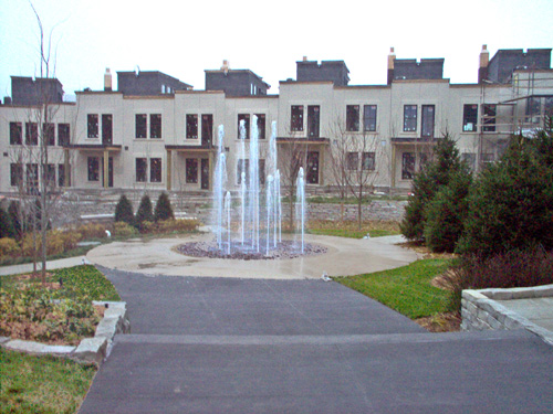 Interactive fountains, like this one, are made possible through the use of underground water reservoirs. This particular fountain features numerous spray jets, controlled by a computer enabling multiple spray programs. This fountain also includes a wind control mechanism that alters the water height to ensure water containment under varying wind conditions.